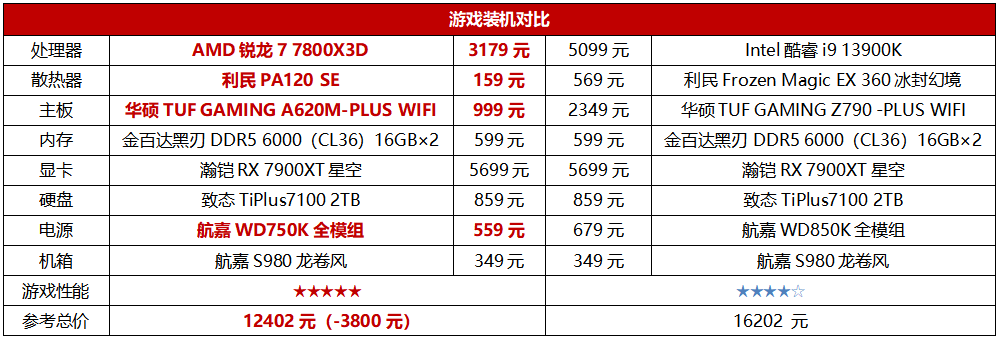从表中的游戏装机配置对比可以看到,锐龙7 7800X3D搭配A620和百元级风冷即可放心使用,而酷睿i9 13900K要保证不过热降频和稳定运行怎么也得配上360水冷和豪华版Z790主板,而显卡也是旗舰级,所以电源也不能低于850W,如此一来装机成本就会大幅上升。所以在总价部分,锐龙7 7800X3D这套主机不但性能更好,而且相对酷睿i9 13900K平台拥有了高达3800元的价格优势,性价比方面做到了完胜。
