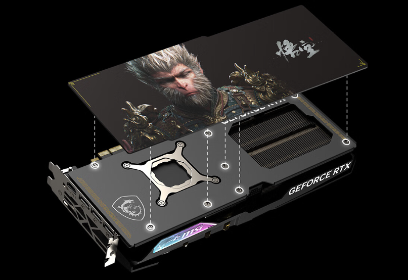 纵观这些《黑神话:悟空》联名显卡除了个别加入了一些设计之外,多数产品就是将游戏壁纸印到显卡上了事。像微星魔龙RTX 4070 SUPER 12G GAMING SLIM WUKONG EDITION,加入悟空图案磁吸式背板之后,将背面的出风口挡住了,反而影响力散热。