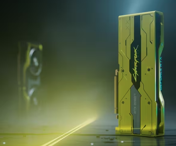又比如《赛博朋克2077》限定版RTX 2080 Ti,显卡配备的是定制的铝制护罩,带有标志性的黄色以及LOGO,带有包装盒,很适合收藏。