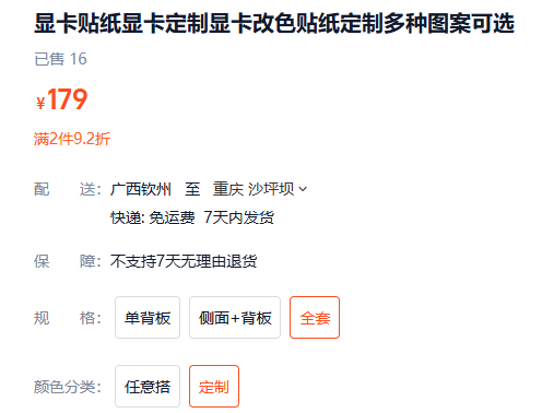 虽说联名显卡的价格确实要比普通版高一些,但也只有100~200元,幅度很有限。要知道现在在淘宝上只是单独定制背板贴纸都要90元,要是来个全套贴纸价格也要179元,而联名显卡好歹也是官方涂装,无论是效果还是质量都更好。