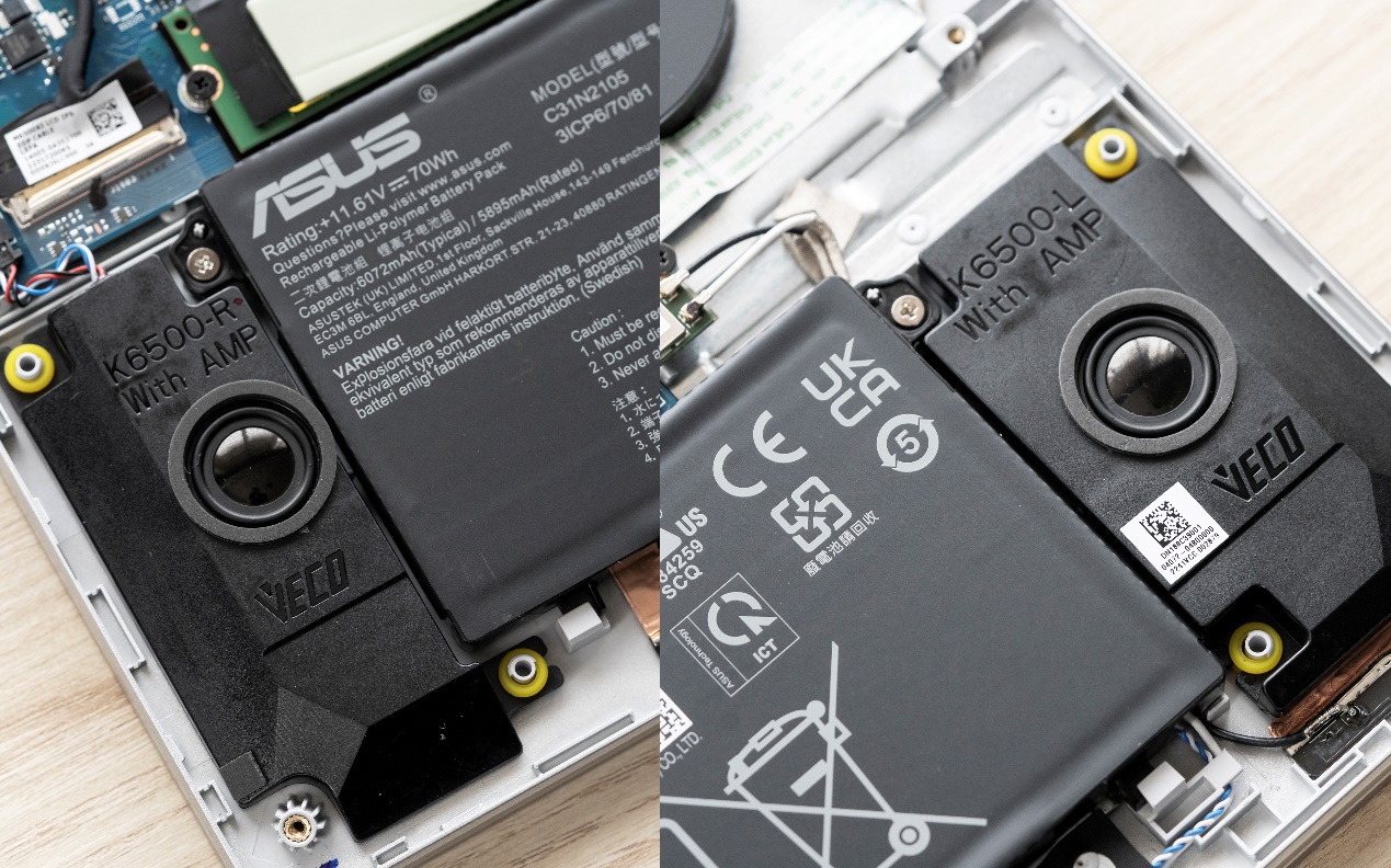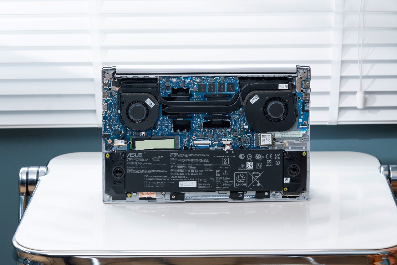 从华硕无畏Pro15 2023的拆机图可以看出,其采用了6mm+8mm双加粗热管双风扇双出风口设计,而且支持耳语、均衡、高能三模式切换。