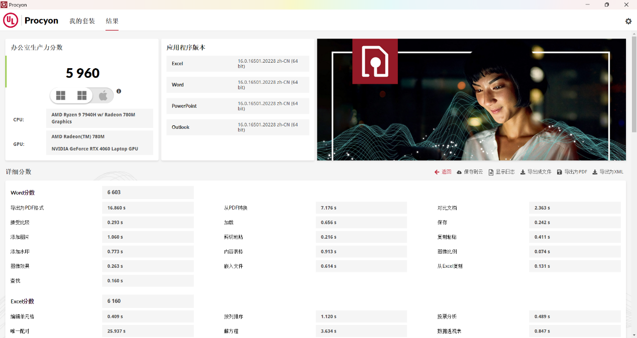 ▲在Procyon的Office2021模拟实操测试中,获得了5960分的成绩。