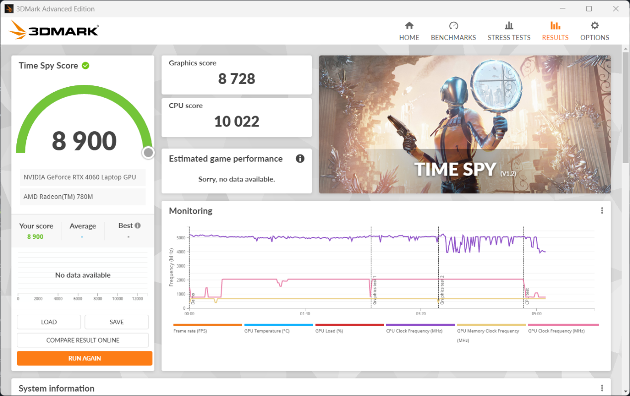 华硕无畏Pro15 2023搭载的RTX 4060在3DMark Time Spy场景中的显卡得分是8728。总体上稍低于140W的RTX 3060,不过幅度都不算大,两者是一个水平的表现。不过考虑到功耗,华硕无畏Pro15 2023的RTX 4060表现就非常出色了,65W功耗比肩RTX 3060 140W,对于轻薄全能本而言,意义重大,这也体现出来Ada架构的革命性突破。在游戏性能方面,从基准跑分推测,华硕无畏Pro15 2023在FHD全高清分辨率最高画质下,流畅运行大部分3A游戏大作都很轻松。