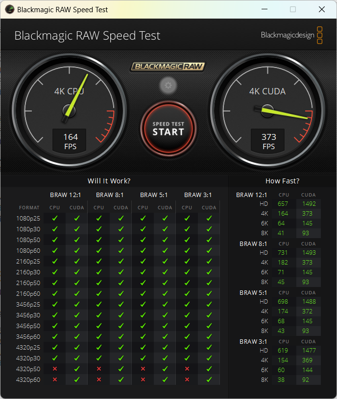 ▲Black Magic RAW SpeedTest主要考察在达芬奇中,对于无压缩原始素材格式RAW的编码转换效率,不同的是它同时考察对不同分辨率下的RAW编码和压缩双料工作。实测CUDA模式下,8K RAW视频素材12:1压缩比编码,RTX4060 效率高达93fps,4K素材效率更高达373fps,为CPU的2倍多!