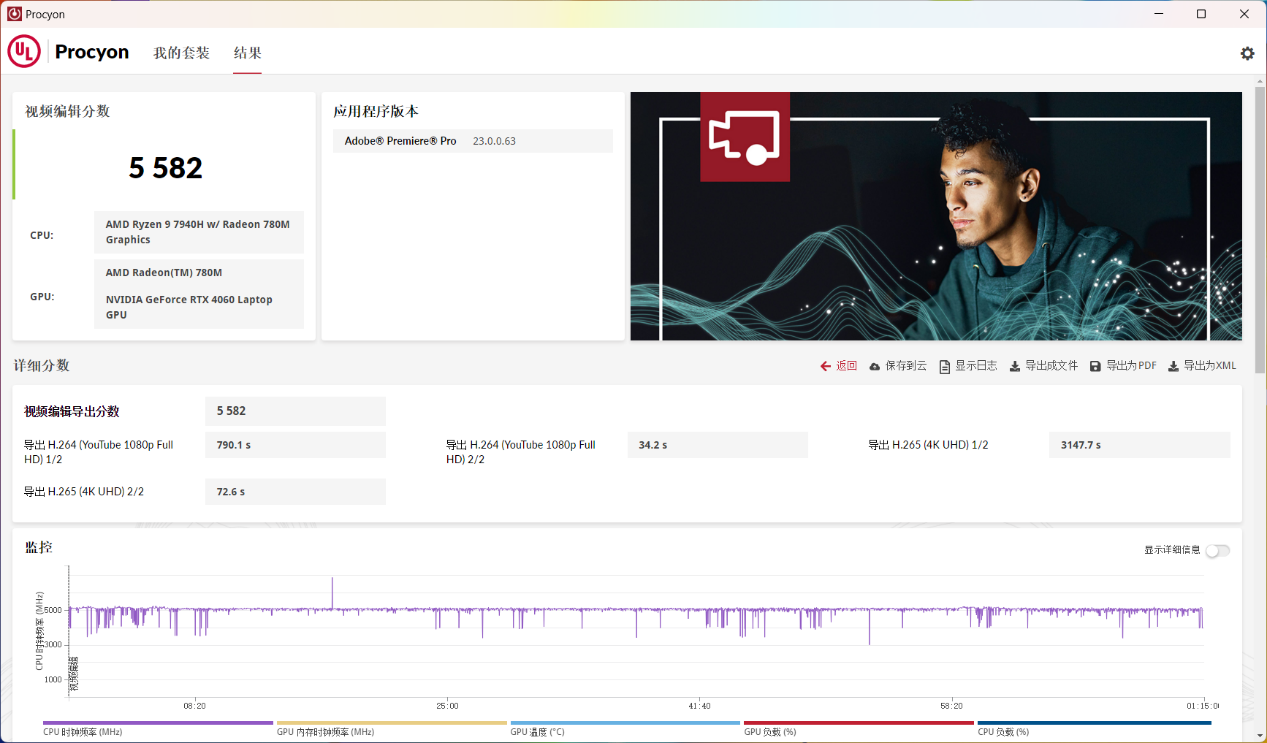 ▲UL Procyon最新版已经采用了和 Puget一样的应用软件脚本模拟操作测试。在视频编辑测试(PR+AE)中,华硕无畏Pro15 2023同样获得了5582分的高分。同样是8核16线程的核显机型分数约3200分——由此可见独显加速在视频剪辑中的高效率意义。