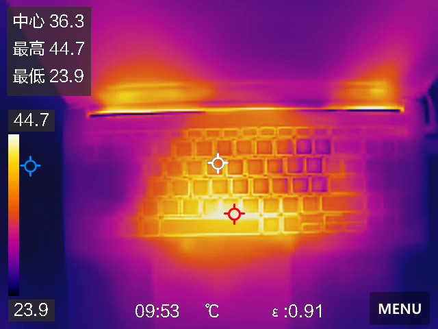 在散热测试上,我们在24℃室温环境下进行双烤,半小时后整机温区最高点在空格键和B键之间的金属空隙处,温度在44℃左右,有一定热感。此时风扇达到了高转速,用户位噪声比较明显,但不吵闹。而左右侧键盘区甚至还没超过30℃,散热控制还是比较好的。