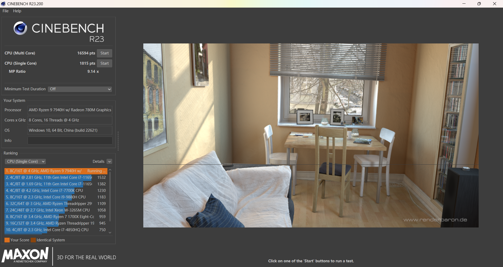 ▲Cinebench R23处理器性能测试中,华硕无畏Pro15 2023多核得分是16594pts,单核1815pts,对比上一代的主流6000系6800H移动处理13007/1493pts提升明显,并且超过了酷睿i7-13700H(70W)的14970pts/1733pts的跑分成绩。
