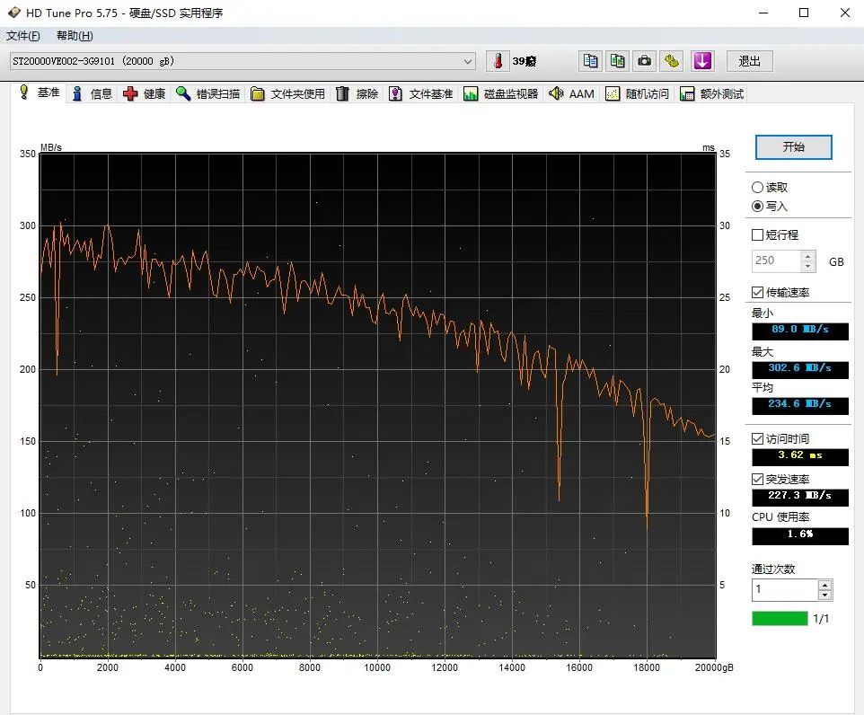 希捷酷鹰人工智能20TB硬盘在CDM测试中,顺序读取速度达到296.06MB/s,顺序写入速度达到282.68MB/s。而在HD Tune测试中,读取平均速度达到215.1MB/s,最低读取速度也高达91MB/s,比我们平常使用的机械硬盘速度表现更加高效;另外,写入平均速度达到234.6MB/s,最低速度89MB/s,最好速度甚至超过了300MB/s。这恰恰是希捷酷鹰人工智能20TB硬盘作为一款专业视频图像应用硬盘的实力表现。
