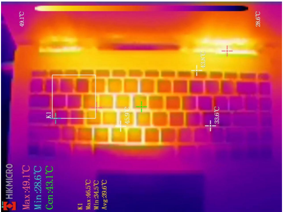 表面温度和噪声:键盘区域热量堆积在键盘中部,最高温度在47℃左右,该部分区域的键帽温度还好,但键缝热感明显。W、S按键约40℃,微有热感。噪声方面,考机满载时用户位约49分贝,在较安静的环境里噪声较明显,但不刺耳。