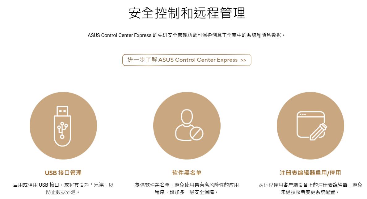 在功能上,华硕的ProArt创艺国度主板提供了先进的ASUS Control Center Express软件,其主要具有三大功能,包括了USB接口管理,启用或停用USB接口,或将其设置为“只读”,以防电脑上的数据外泄;设置软件黑名单,避免使用高风险性的程序,增加电脑的安全保障;注册表编辑器,用户可以在远程停用客户端设备上的注册表编辑器,免未经授权者变更系统配置。?