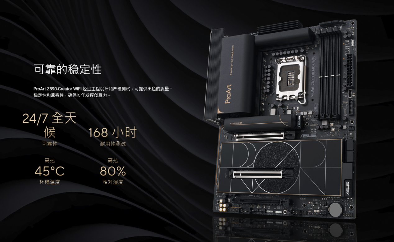 提起生产力产品,高稳定性也是其一大卖点。华硕的ProArt创艺国度主板除了强化供电部分的用料,确保CPU的稳定供电之外。主板在生产时进行了优化设计和严格测试,经过168小时(45℃/80%相对湿度)下的不间断渲染工作测试,确保主板具有出色的质量、稳定性和兼容性,能满足7×24小时的稳定工作需要。