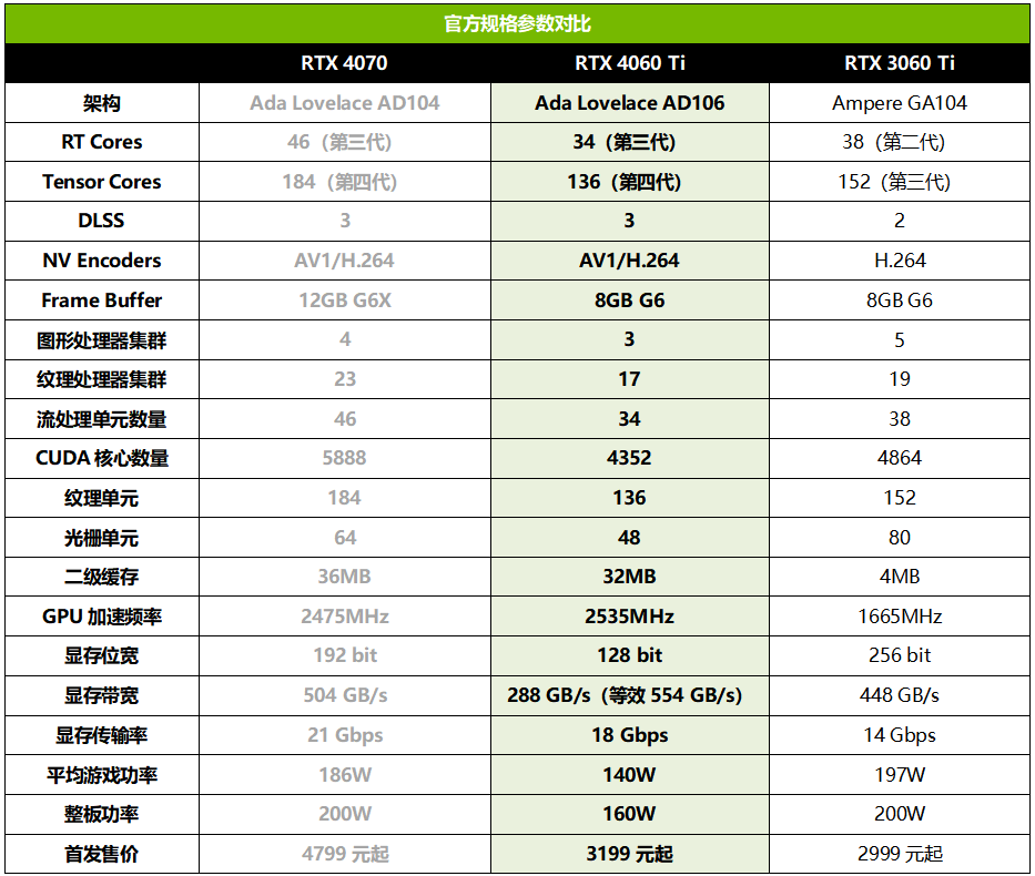显存规格方面,RTX 4060 Ti搭载了128bit/8GB GDDR6显存,看上去288GB/s的带宽似乎低于RTX 3060 Ti,但不要忘了RTX 4060 Ti具备32MB二级缓存,是RTX 3060 Ti的8倍,而超大的二级缓存会极大地提升数据命中率,减少计算过程中对显存带宽的依赖。