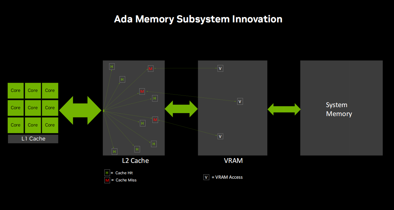 Ada Lovelace架构超大二级缓存设计可以大幅提升数据命中率,有效降低GPU对显存的访问需求,因此对显存位宽的要求也大幅降低