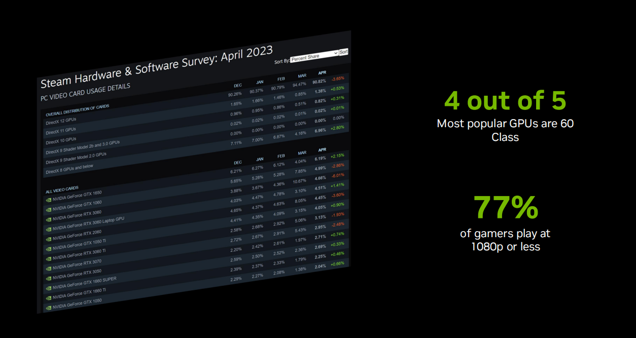 80%的玩家还在使用“60”系GPU,77%的玩家还在使用1080P分辨率玩游戏,因此面向主流玩家的RTX 4060 Ti定位自然应该是“1080P高帧率光追游戏体验”