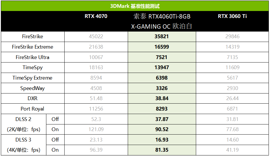 首先来看看3DMark基准测试的情况。索泰RTX4060Ti-8GB X-GAMING OC欧泊白大幅领先于上一代的RTX 3060 Ti。其中,FireStrike项目中两者的差距最大,提升幅度达到了大约20%;2K分辨率的FireStrike Extreme项目中提升了15.9%,4K分辨率的FireStrike Ultra项目中领先5%。