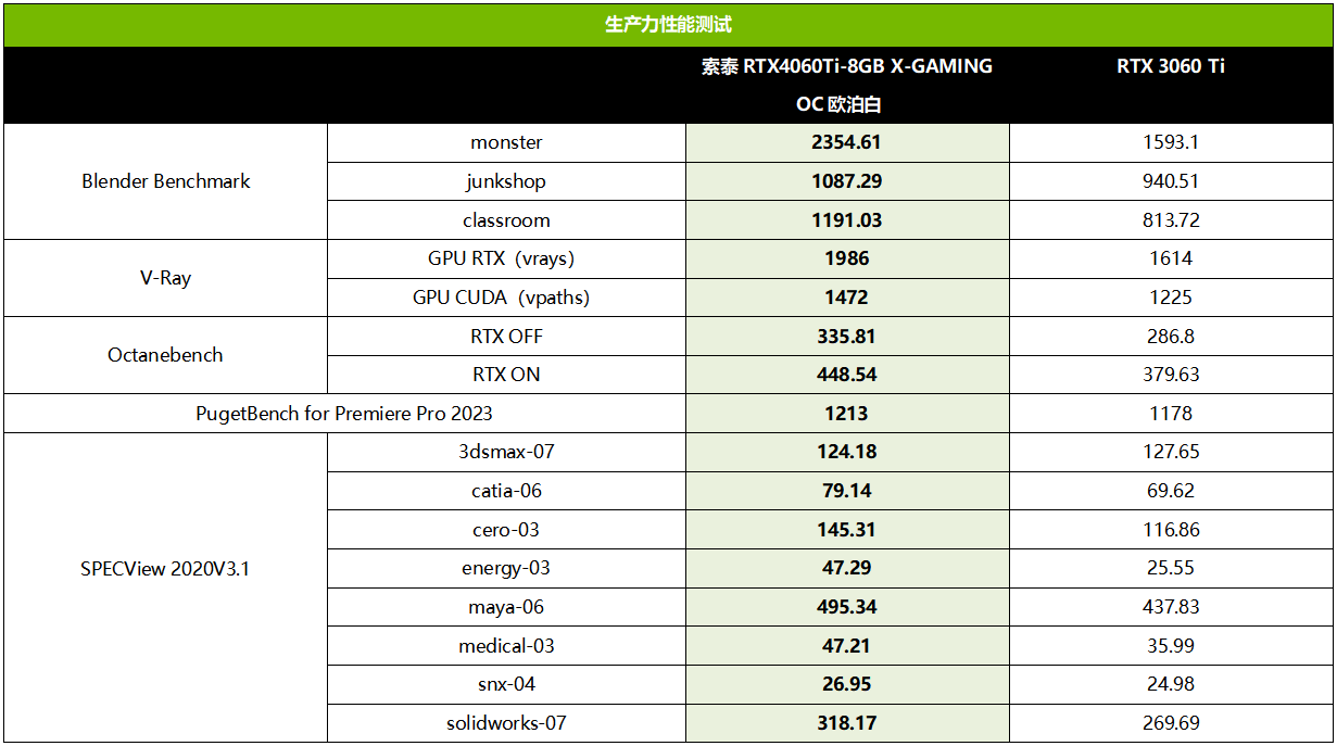 有了第三代RT Core和第四代Tensor Core的加持,RTX 4060 Ti在生产力软件中也会有不错的表现。从测试结果来看,RTX 4060 Ti的性能表现确实是大幅领先于RTX 3060 Ti。这就意味着,RTX 4060 Ti不仅仅是一款游戏显卡,用来进行一些生产力应用也是比较不错的选择。