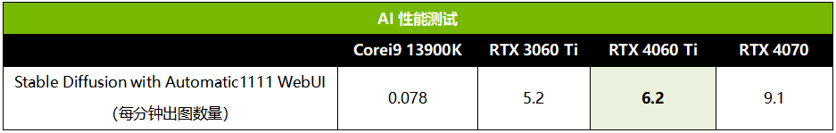 我们使用Stable Diffusion来考查RTX 4060 Ti的文生图出图效率。在同样的设置情况下,RTX 4060 Ti的出图效率大约是RTX 3060 Ti的119%,是RTX 4070的68%。对于想学习AIGC的主流玩家来讲,RTX 4060 Ti算得上是一个性价比非常不错的甜品级选择。