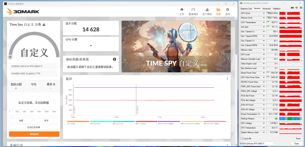 当然这并不是索泰RTX4060Ti-8GB X-GAMING OC欧泊白全部的实力,显卡功耗墙可以上调的范围为115%,完全解锁功耗墙之后,我们将显卡的核心频率和显存频率分别调高了250MHz和150MHz,再次运行3DMark Time SPY场景时,显卡的核心频率和显存频率分别达到了3000MHz和2287MHz,分数也从13570提升到了14628,幅度达到了7%。当然超频之后,显卡的整板功耗也有所上升达到了186.5W。
