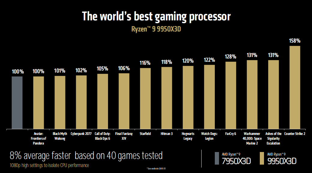 从官方公布的对比数据来看,锐龙9 9950X3D和上代锐龙9 7950X3D相比,游戏性能最高可提升58%,40个游戏测试项目平均提升幅度大约为8%。
