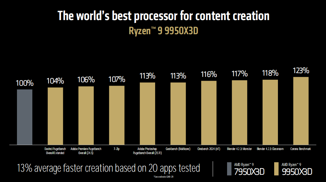 得益于16核32线程的配置以及5.7GHz最高加速频率,锐龙9 9950X3D在生产力方面的性能表现也非常抢眼,在20个生产力应用中相对上代锐龙9 7950X3D的平均提升幅度为13%,最高提升23%。