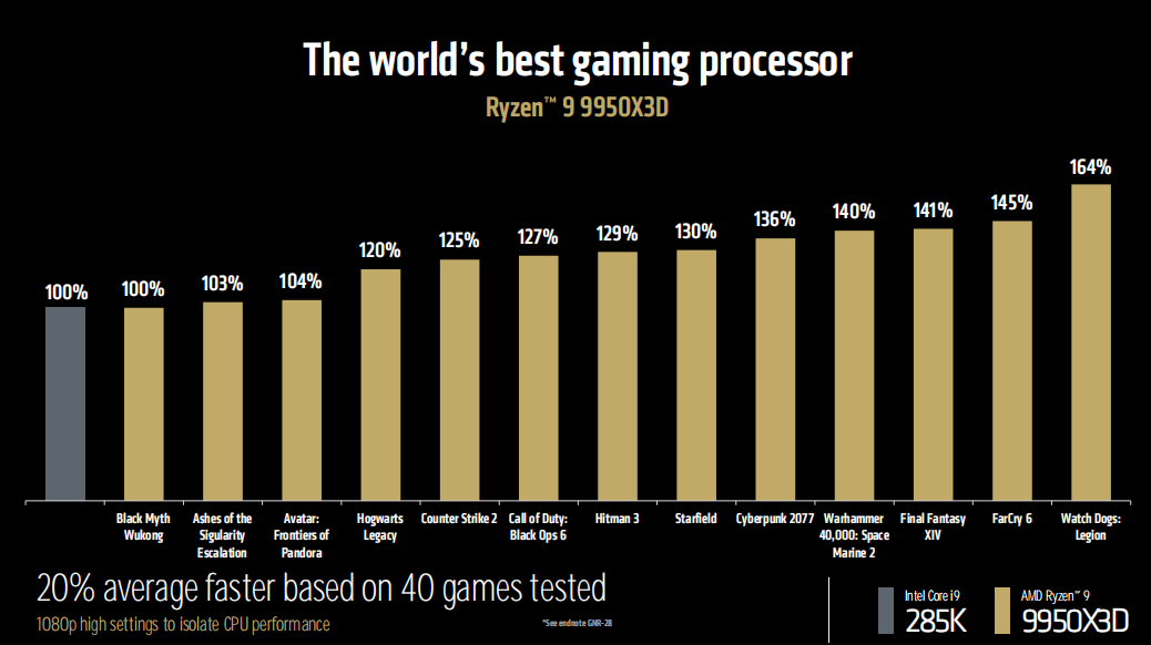 如果和酷睿Ultra 9 285K相比的话,游戏性能最多可提升64%,40个游戏平均提升幅度可达20%之多。