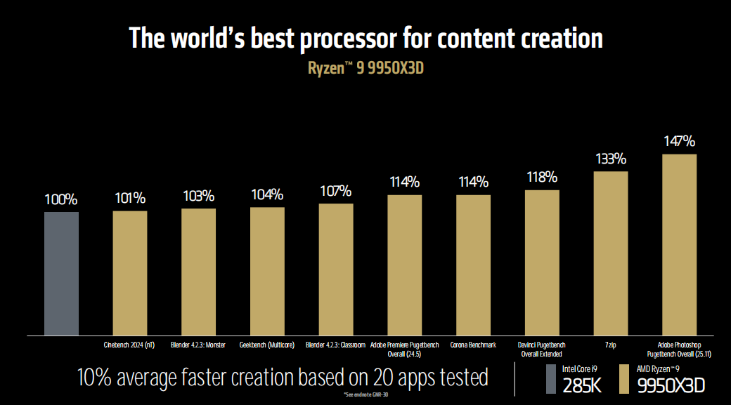 和酷睿Ultra 9 285K相比,锐龙9 9950X3D在20个生产力应用中的平均优势也达到了10%,在Photoshop测试中甚至领先了47%。除了Zen5本身效率高之外,超大三级缓存在某些生产力应用中也带来不小的收益。