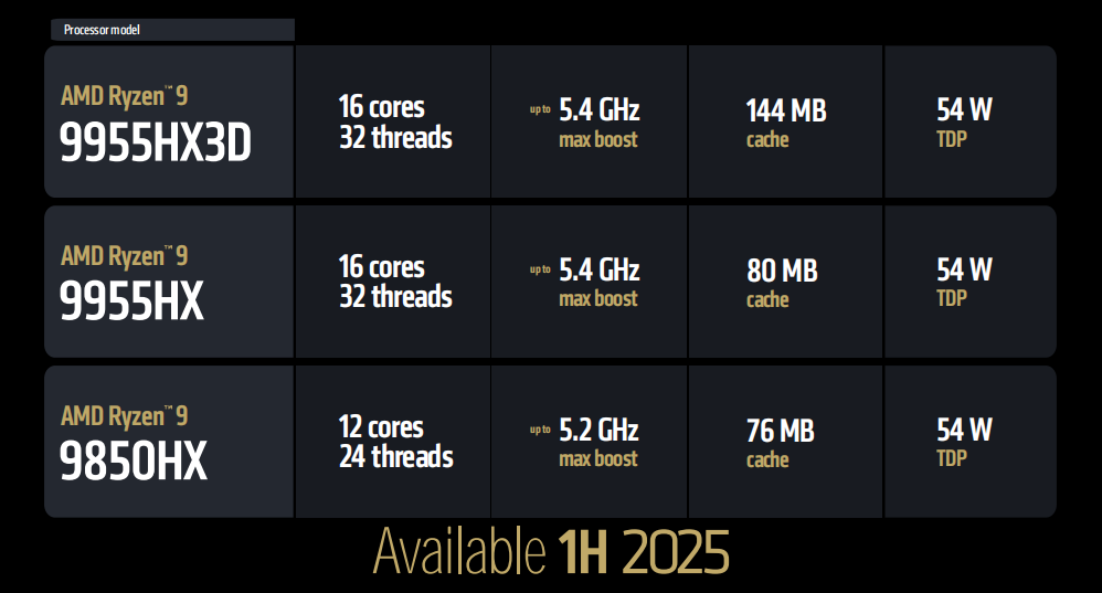 首发登场的HX3D系列处理器目前只有锐龙9 9955HX3D一款,它具备16核32线程,最高加速频率高达5.4GHz,二级三级缓存总容量高达144MB(包含64MB 3D V-cahe缓存),和桌面平台的锐龙9 9950X3D保持一致,TDP方面则是54W。此外,和锐龙9 9955HX3D一起发布的,还有HX系列的两款高性能移动处理器,分别是锐龙9 9955HX和锐龙9 9850HX,前者可以看成是没有3D V-Cache的锐龙9 9955HXD,同样是16核32线程,而后者则是12核24线程的非X3D版本,最高加速频率也小降了200MHz。这三款移动处理器也会在2025年上半年上市,打算入手高性能AMD锐龙笔记本的玩家,一定要关注一下。