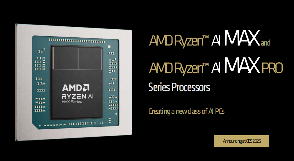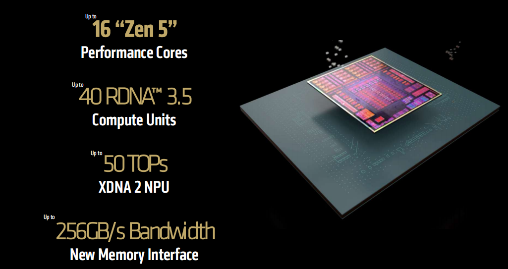 锐龙AI MAX/AI MAX PRO系列移动处理器最高拥有16个Zen5处理器核心、40个RDNA 3.5 GPU核心、配备50 TOPS算力的XDNA 2 NPU,内存带宽最高可达256GB/s,并使用了全新的内存接口。