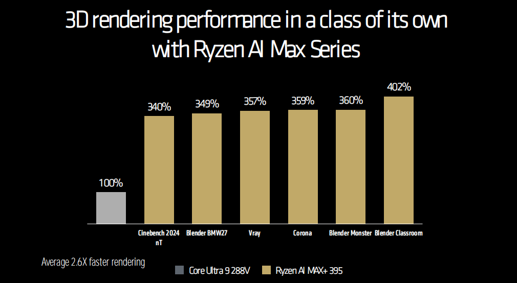 从官方宣布的数据来看,锐龙AI MAX+ 395在3D渲染输出类生产力应用中相比酷睿Ultra 9 288V最低提升240%,最高提升302%,平均领先260%之多,16核32线程的规格确实太强大。