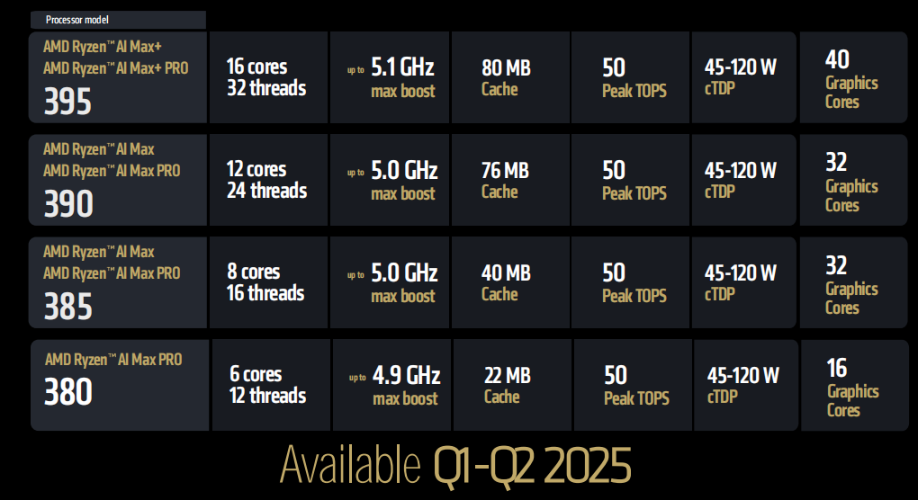 首发登场的锐龙AI MAX系列一共有7款,包含锐龙AI MAX+ 395、锐龙AI MAX 390、锐龙AI MAX 385和它们的PRO版(带AMD PRO技术的商用版),以及锐龙AI MAX PRO 380——这一款就只有PRO版了。所有7款处理器的TDP都是45W~120W可调,内置50 TOPS算力的XDNA 2 NPU。