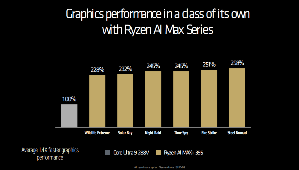 而在3DMark的GPU基准测试中,锐龙AI MAX+ 395最低领先酷睿Ultra 9 288V大约128%,最高领先158%,平均领先幅度高达140%。我们知道拥有8个Xe核心的Intel 核显TimeSpy GPU得分大概是3700分水平,按照这个幅度来估算,锐龙AI MAX+ 395的TimeSpy GPU得分甚至能上9000分,位于移动版的满血RTX 3060和RTX 4060之间,这无疑是内置GPU性能的一次飞跃,搭载锐龙AI MAX+ 395的笔记本完全可以和主流游戏本正面硬刚!