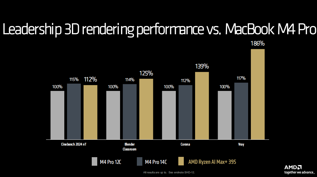 在3D渲染性能部分,AMD拿出了锐龙AI MAX+ 395与苹果M4 Pro处理器的对比数据。从图上来看,锐龙AI MAX+ 395在全部测试项目中都明显领先12核的M4 Pro,最高领先幅度可达86%,而面对14核的M4 Pro,锐龙AI MAX+ 395也有三项领先,最高领先幅度可达59%。