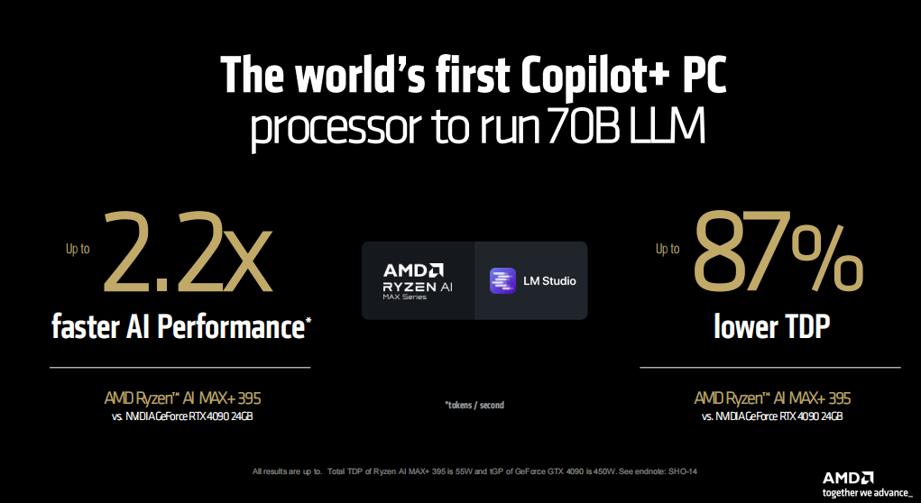 AMD甚至拿锐龙AI MAX+ 395与台式RTX 4090对比了一下AI性能。在运行70B的大语言模型的测试中,锐龙AI MAX+ 395提供了相当于RTX 4090最高2.2倍的AI性能,而相对RTX 4090最多节约了87%的TDP。