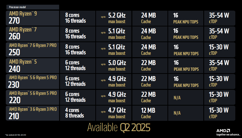 最后就是面向长续航和高性价比机型的锐龙200系列了,它们会在2025年第二季度上市。从规格来看,这一系列从锐龙9 270到锐龙5 230都配备了16 TOPS峰值算力的NPU,而入门款的锐龙5 220和锐龙3 210及它们对应的Pro版就去掉了NPU,定位极致性价比。规格配置部分,锐龙200系列最高拥有8核16线程,最高加速频率5.2GHz,二三级缓存总容量最高24MB,可配置TDP从35W~54W。
