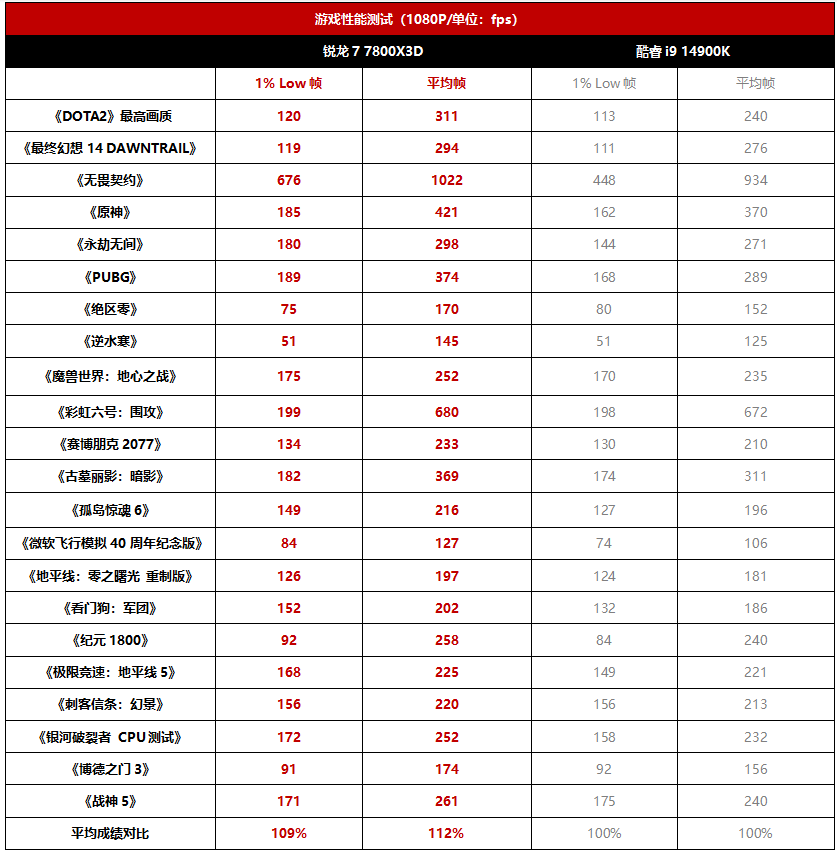 我们一共测试了22款游戏。从实测情况来看,锐龙7 7800X3D在《DOTA2》和《PUBG》这类电竞网游中的优势非常大,平均帧分别领先了酷睿i9 14900K大约30%和29%,综合全部游戏领先幅度,平均领先酷睿i9 14900K的幅度大约为12%。特别值得一提的是,锐龙7 7800X3D在《无畏契约》中的平均帧也超过了1000fps,证明它也和锐龙7 9800X3D一样属于“千帧俱乐部”成员,这个俱乐部目前主要成员都来自锐龙X3D家族。超高的帧率无疑能带来更快的操控响应速度,让玩家在对战中无往不利。此外,在体现游戏体验平滑度的1% LOW帧部分,锐龙7 7800X3D也明显领先了酷睿i9 14900K,幅度大约为9%。可以说,在游戏实际体验部分,锐龙7 7800X3D的综合表现是完胜酷睿i9 14900K的。