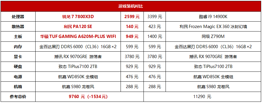 游戏性能方面,锐龙7 7800X3D赢得毫无争议,那么实战装机的性价比方面呢?从我们列出的两套配置来看,锐龙7 7800X3D由于功率更低,因此在散热器、主板和电源方面要求更宽松。我们这里选择了性价比级的A620主板与锐龙7 7800X3D搭配,同时还使用了百元风冷,因此,即便大家都选配了850W电源,锐龙7 7800X3D这套主机的总价相对酷睿i9 14900K主机也有1534元的优势。由此可见锐龙7 7800X3D在实际装机时的性价比也是完全胜过酷睿i9 14900K的。此外,A620主板未来还能升级Zen6处理器,而酷睿i9 14900K使用的Z790主板到手就已经淘汰了,未来升级只能换掉,这一点对装机的朋友来讲不可忽视。