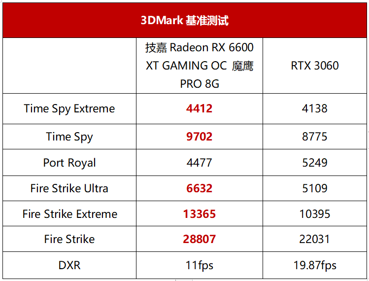 对比显卡我们加入了和RX 6600 XT同为甜品级别的RTX 3060的成绩。在理论测试中我们看到,技嘉RX 6600 XT 魔鹰 PRO 8G GAMING OC 魔鹰 PRO 8G显卡实际表现均要强于RTX 3060,在基于DX11的Fire Strike测试中,我们看到这款显卡相比于RTX 3060有超过28%的提升,在基于DX12的Time Spy系列测试中,提升也接近10%。光追表现上,RX 6600 XT相比RTX 3060落后16%左右。