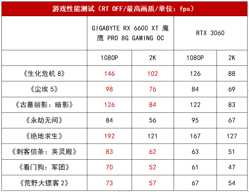 技嘉Radeon RX 6600 XT 魔鹰 PRO 8G搭载了AMD RDNA2架构的甜品级GPU核心,在散热和用料方面的表现比较不错,风之力三风扇散热系统和扎实用料为玩家提供了稳定的使用保障。从测试结果来看,在1080P和2K分辨率下都能有让人满意的帧率表现,FSR技术的加持让它在2K分辨下游玩光追大作成为了可能。在超频与散热方面,技嘉RX 6600 XT 魔鹰 PRO 8G很轻松地就超到了2680 MHz,性能进一步提升,其优秀的散热性能给我们留下了比较深刻的印象,可见还有很大的潜力可供挖掘。想要在近期组建主机的玩家,不妨关注一下吧。