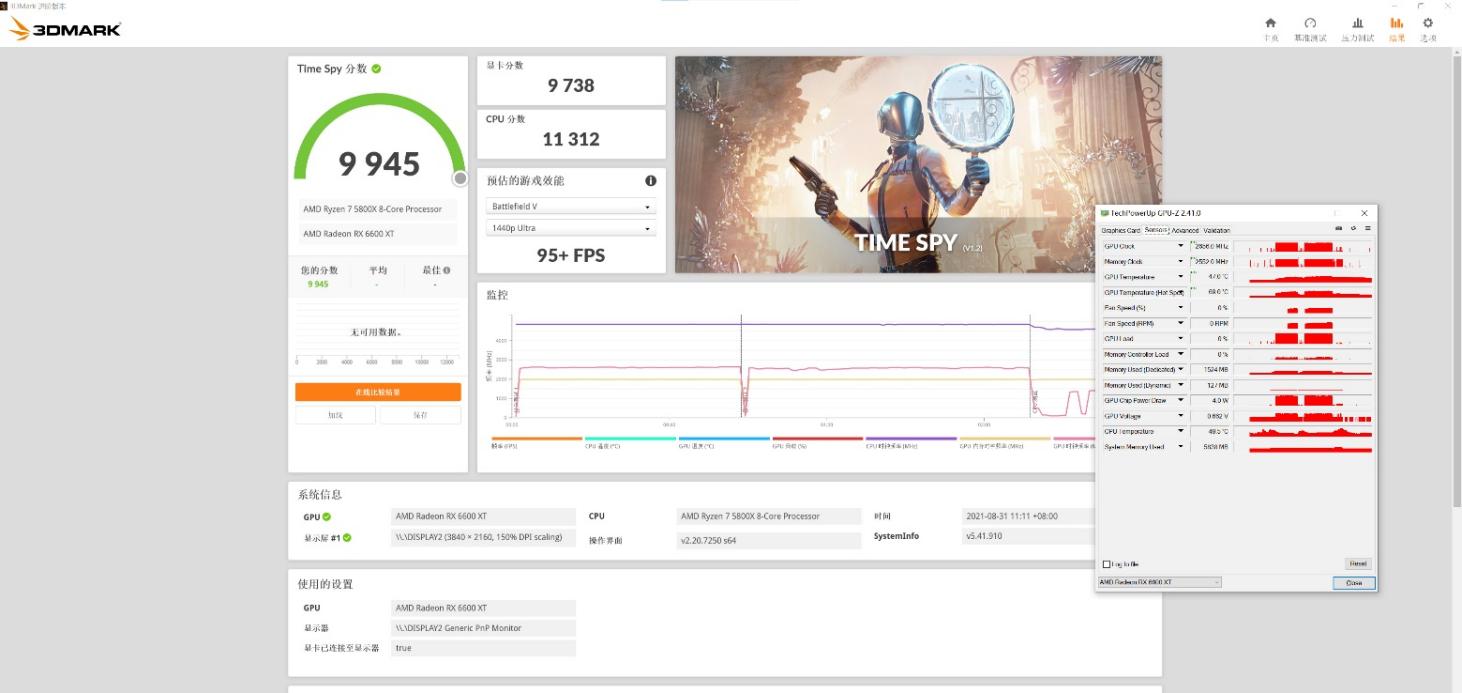 扎实的用料和出色的散热设计也为超频打好了基础,我们通过首先在AMD显卡驱动面板中尝试自动超频,GPU频率被自动设定为了的2649MHz,然后,我们将GPU频率直接拉高到2680MHz并将风扇设置为全速,此时运行3DMark测试GPU温度仅为47℃,同时TimeSpy的分数也从9702提升到了9945,散热和性能都很给力。