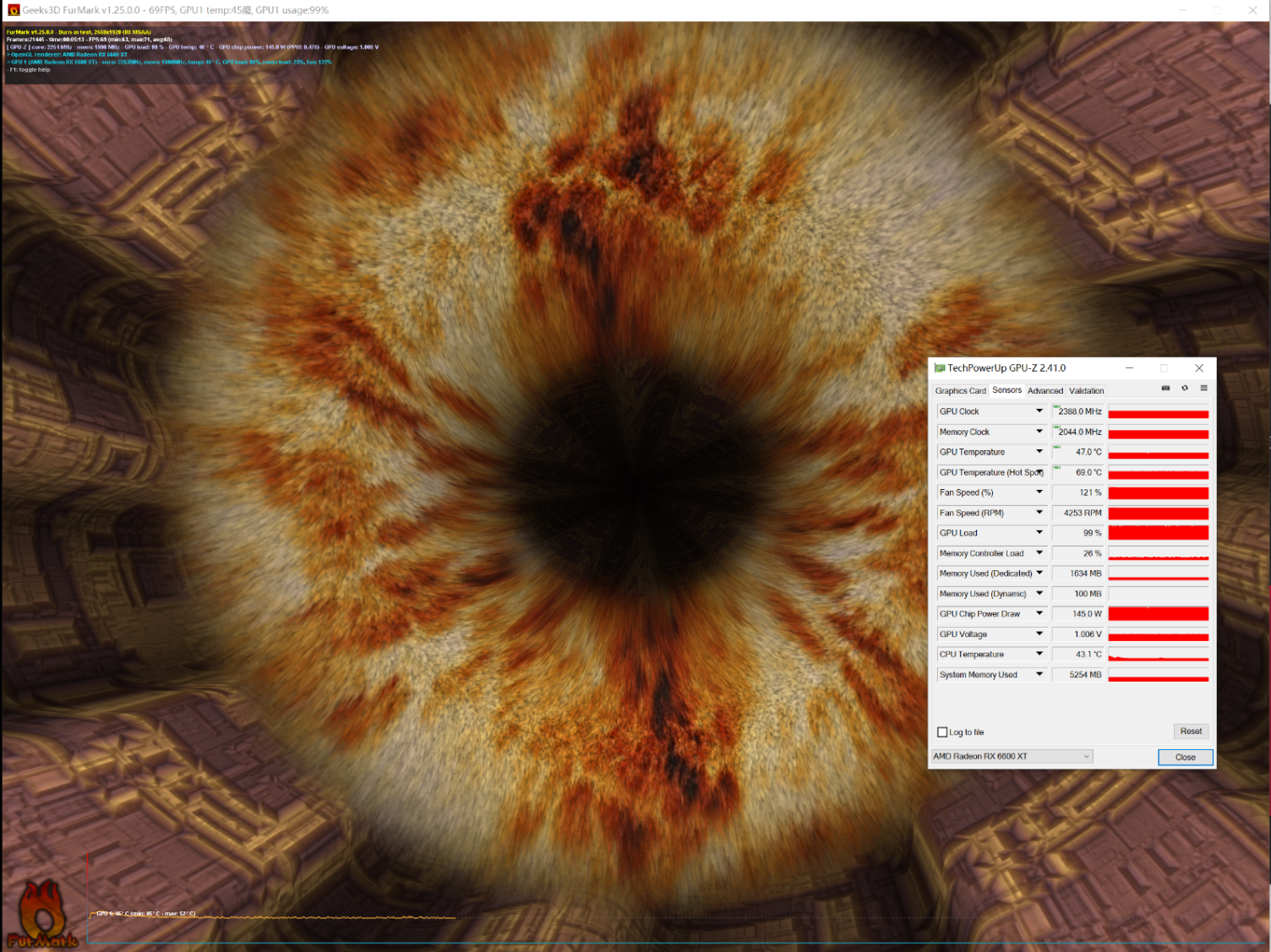 温度测试方面,我们使用FurMark对其进行了15分钟的考机。得益于风之力散热系统的加持,在室温27℃的环境中,其最高温度为62℃,此时的风扇转速为47%,风扇噪声并不明显,散热效果不错,此时的BOOST频率达到了2388MHz。接着我们将风扇转速手动拉至100%再进行考机,GPU温度直接下降到47℃,而BOOST频率也可以稳定在2588MHz。从GPU-Z我们可以看到,该显卡在考机满载时的默认功耗仅为144W,能耗比表现非常出色。