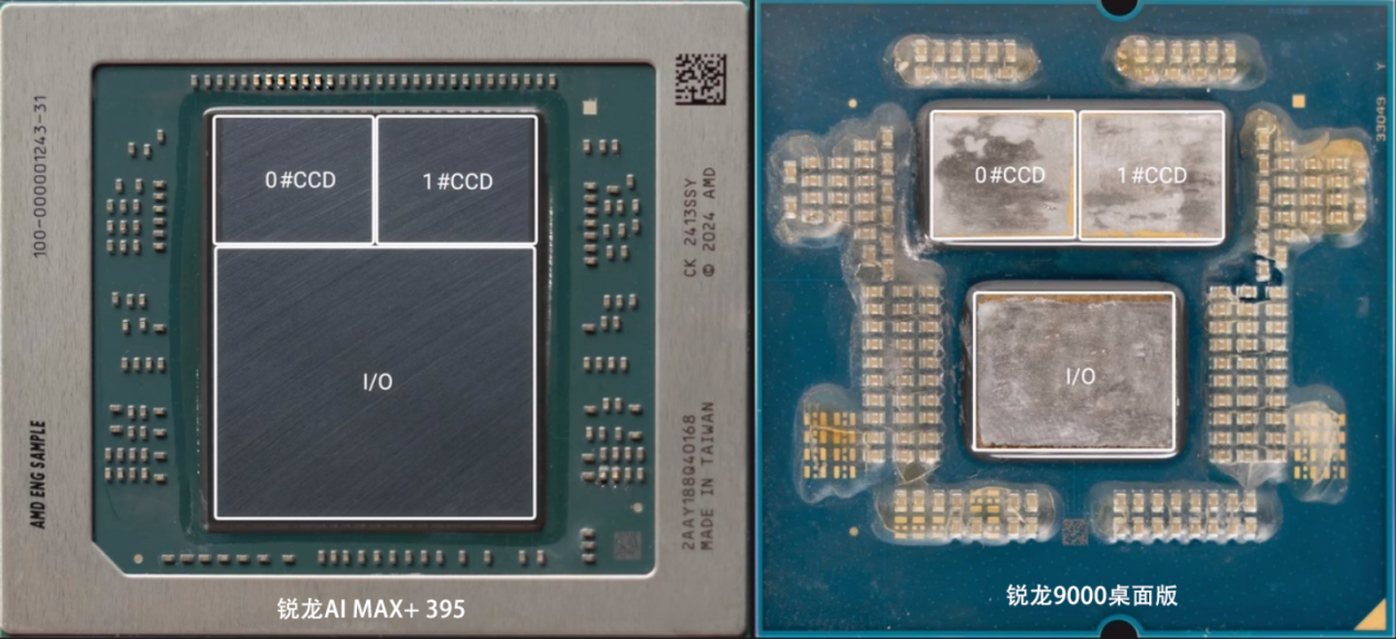 其次,大家可以看到锐龙AI MAX+ 395的IOD面积暴增,达到了惊人的307.58mm2,远大于桌面版锐龙9000的IOD,这是因为它内置了史上最强核显Radeon 8060S。Radeon 8060S采用RDNA 3.5架构,配备40个CU单元,32MB无限缓存,8个32bit显存控制器,总位宽256bit。除此外,IOD里还包含了NPU,算力为50 TOPS;两个媒体引擎和一个显示引擎。正是因为内置了性能媲美主流独显的Radeon 8060S,锐龙AI MAX+ 395也被玩家称为史上最强APU。