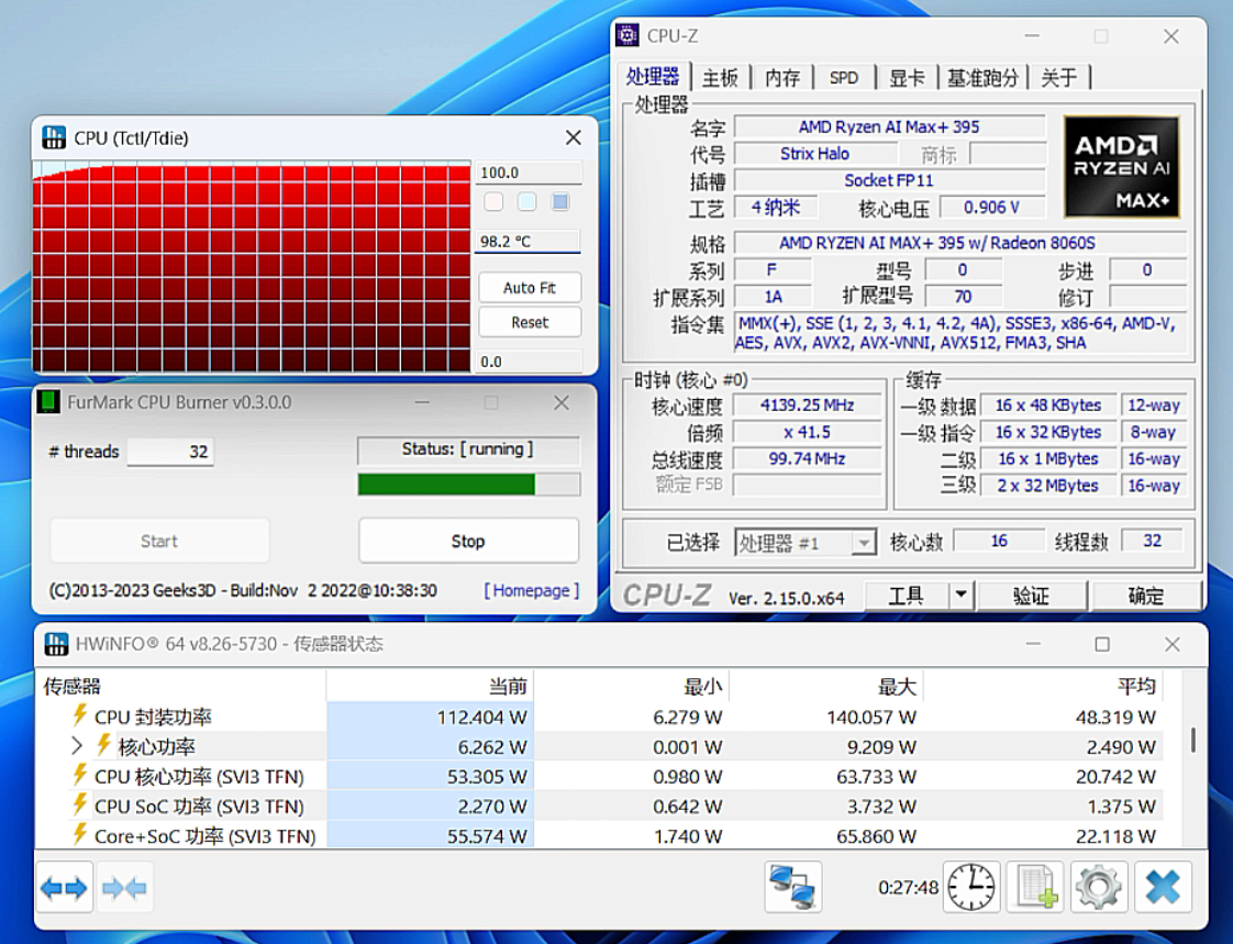 ▲单考模式下,锐龙AI MAX+ 395峰值封装功率可达140W,稳定释放功率大约在120W,考机半小时之后大约在112W左右