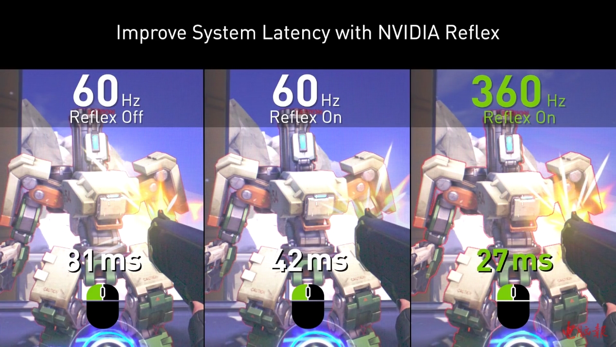 从已经搭载了NVIDIA Reflex技术的电竞游戏如《守望先锋》中,我们可以看到,在使用60Hz刷新率且Reflex处于关闭状态时,从玩家点击鼠标左键到显示器显示射击画面的延迟达到了81ms,而在60Hz时开启Reflex,这个延迟则可以降低接近一半,只有42ms。而在360Hz的刷新率下开启Reflex时,延迟则可以进一步降到了27ms,仅为原来的三分之一。