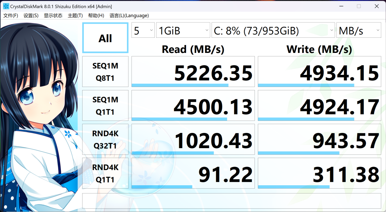 存储部分,宏碁非凡Go Pro 搭载的是16GB双通道DDR5内存和1TB PCIe 4.0 SSD的配置。我们通过CrystalDiskMark测出,该SSD的顺序读写速度分别为5226MB/s和4934MB/s,性能和容量兼备。值得一提的是,宏碁非凡Go 提供的是双M.2硬盘位,还有一个M.2插槽用于升级,只需将D面拆下,可以轻松实现硬盘的扩容。同时内存为插槽设计,也可替换升级,所以,对于看重扩展性的用户来说,该机的升级性已经拉满了。