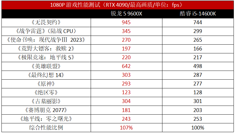 在实际的游戏中,锐龙5 9600X相较于i5-14600K可谓是优势极大:《英雄联盟》中领先29%之多,《无畏契约》也领先27%,《荒野大镖客:救赎2》中领先19%……综合12款游戏测试成绩来看,锐龙5 9600X的游戏性能领先了7%。
