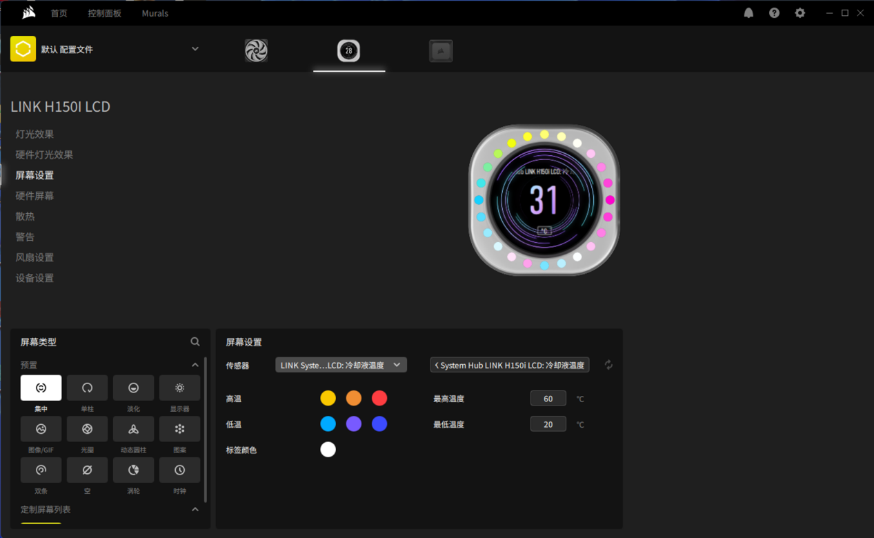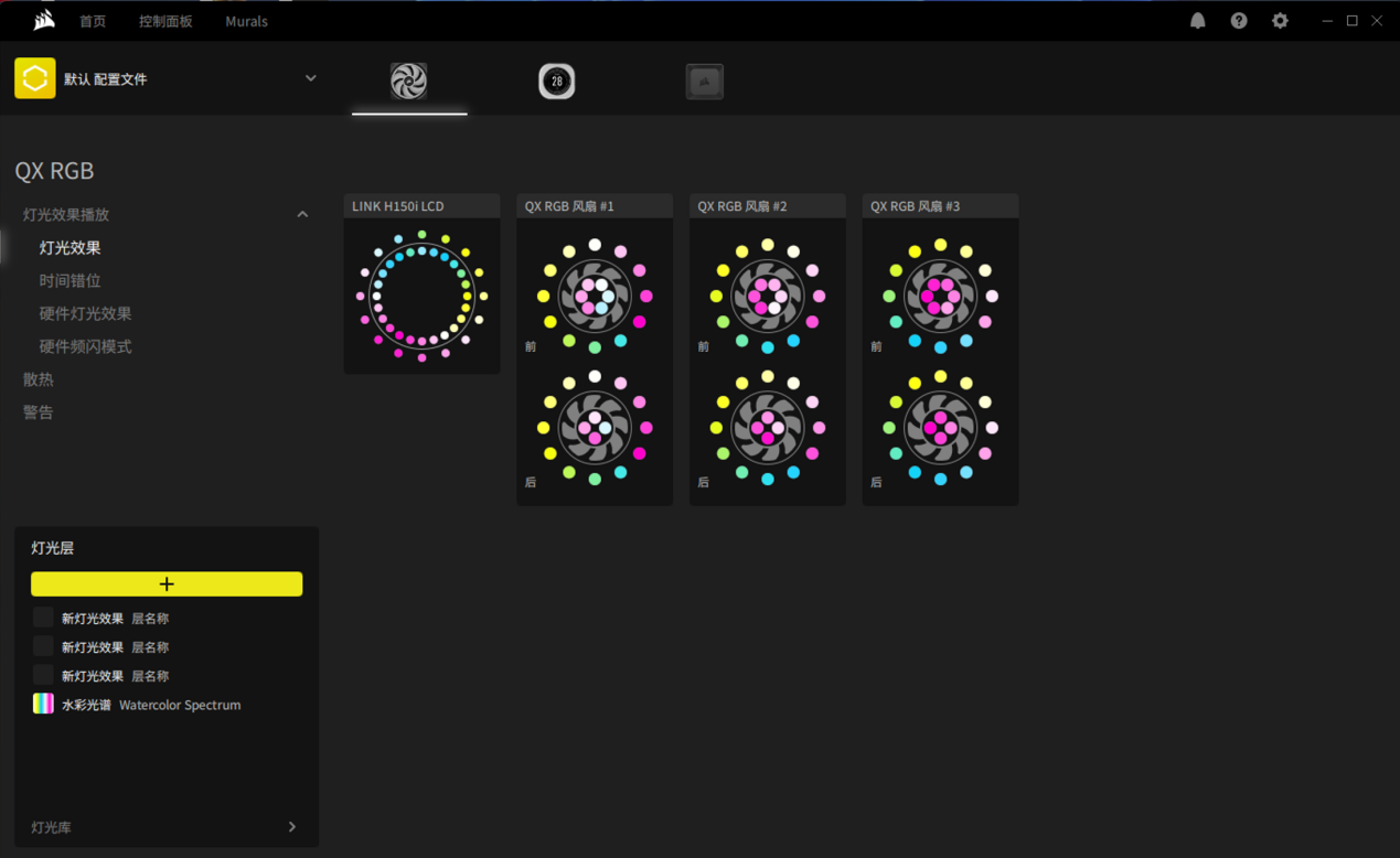 除了有屏幕,产品还有炫酷的灯效做装饰。美商海盗船iCUE LINK H150i LCD的水冷头上还设置了24颗RGB LED灯珠,搭配每个QX120 RGB上的34颗RGB灯珠,开机后可以呈现出非常炫酷的灯光效果。而且在iCUE控制软件中,还可以对所有RGB灯珠进行丰富的设置,玩家可以尽情释放自己的创意。