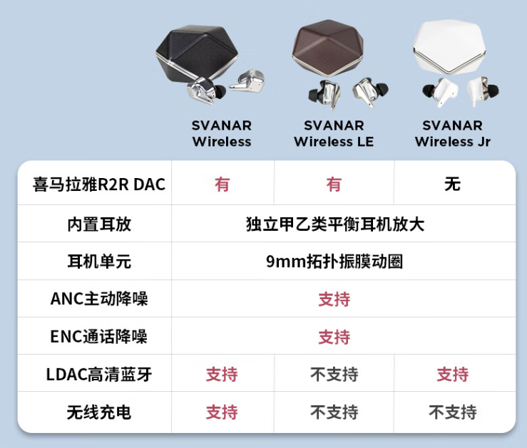 总结一下,就是LE轻奢版保证了最核心的声学设计理念和配置,而去掉了对音质影响较小的配置,同时对一些辅助性功能(无线充电)和材质(内侧贴耳部分材质)进行了downgrade,但又在声学配置和总体材质上,维持了比SVANAR Wirless Jr“青春版”高很多的配置水平,通过牺牲次要特性,保证主要特性,从而在最核心的体验上,保证和满血极奢版无线天鹅的一致!