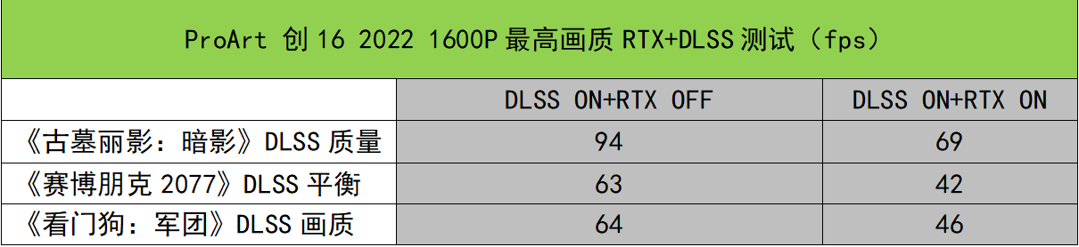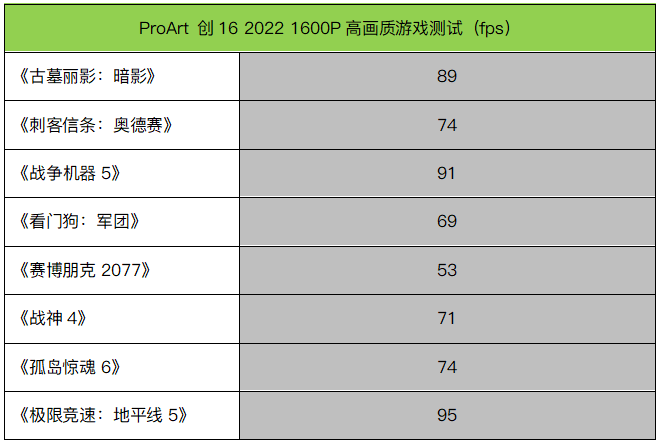 从测试成绩来看,ProArt 创16 2022在1600P分辨率下基本可以预设高画质搞定3A大作,除了一贯优化烂的《赛博朋克2077》以外,游戏总体帧速69fps~95fps之间。也就是说,对于部分游戏,在1600P下,你可以开启更高一档的画质运行。