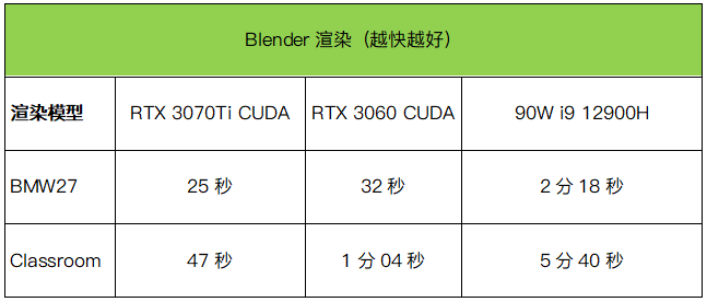 Blender是一款开源的跨平台全能三维动画制作软件,支持处理器和独显渲染,这里我们通过对比RTX 3060的CUDA加速测试,来考查ProArt 创16 2022的独显渲染性能,并且加入了上面的i9-12900H测试成绩作为对比。从测试成绩来看,RTX 3070Ti GPU CUDA渲染相比处理器渲染效率提升极为明显,在耗时较长的Classroom中,CPU渲染耗时需要5分40秒,而GPU CUDA耗时不到1分钟(RTX 3060测试成绩是1分04秒),效率直接翻了数倍。
