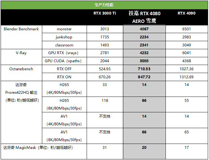 作为一款主打设计师群体的高端显卡,大家最想了解的肯定是技嘉RTX 4080 AERO雪鹰在生产力应用中的表现。由于其拥有16GB GDDR6X超大显存,同时具备双视频编码器,对于3D设计和视频后期剪辑应用来讲也是一款非常强大的生产力神器。